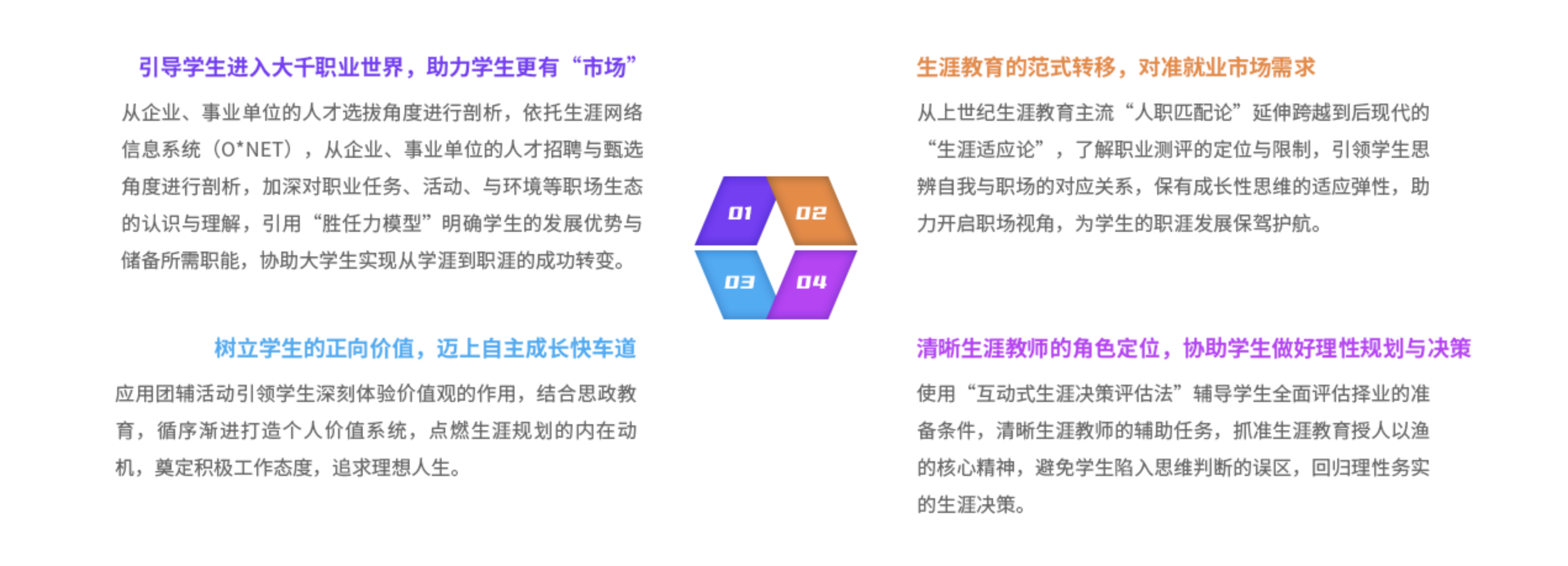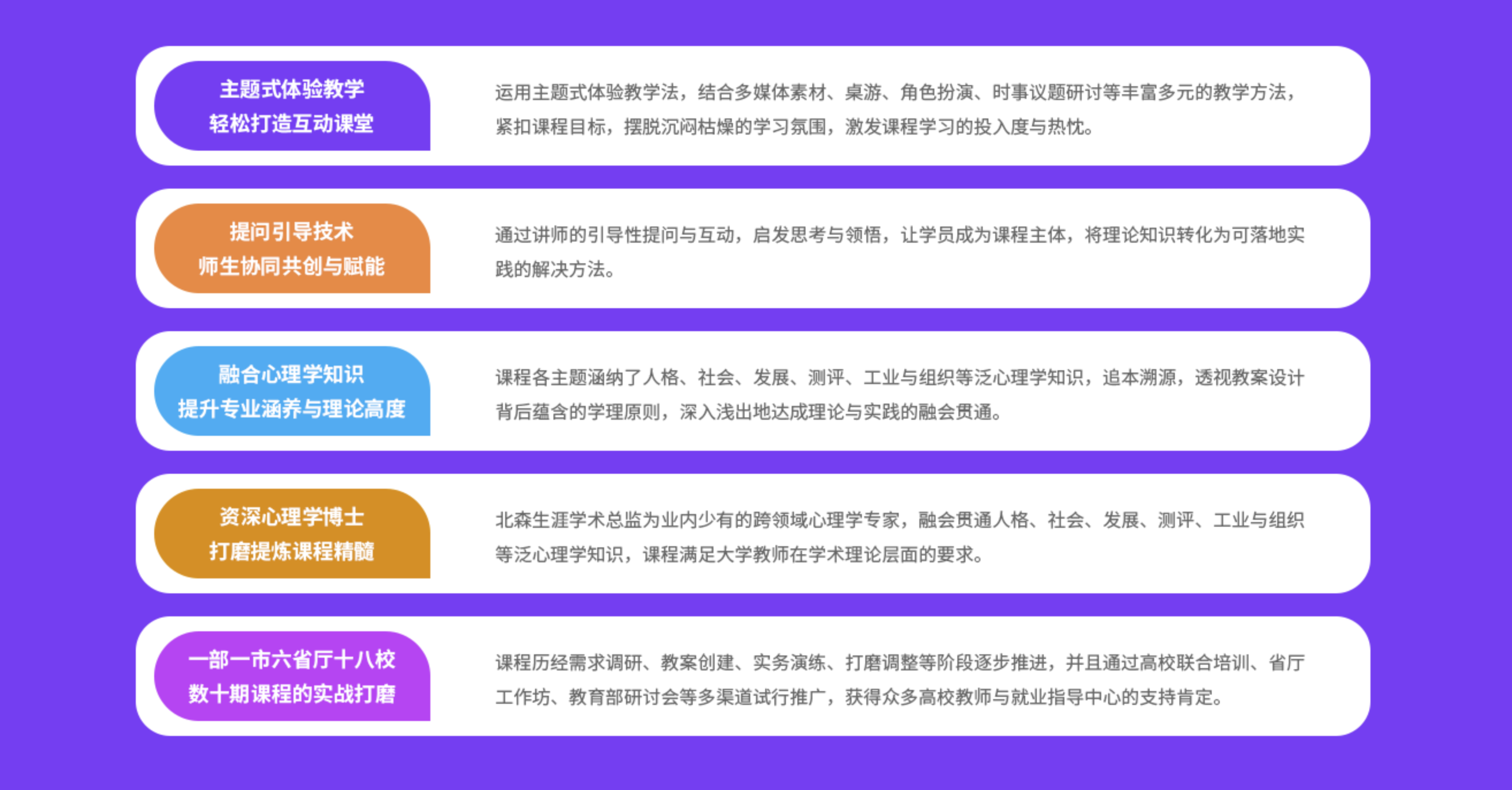本课程基于高校学生能否顺利完成“学一职转衔”的主要问题与困境研发,以企业人才管理为基础的“胜任力模型”与“生涯适应观”进行生涯规划的创新教学与咨询,帮助学生有目标性的预先规划,加强就业竞争力与职业生涯适应能力。此外,课程会带领学员深入思辨目前常见的生涯课程设计原理与限制,并提出相应的创新解决之道,谋求专业领域的精进与突破。