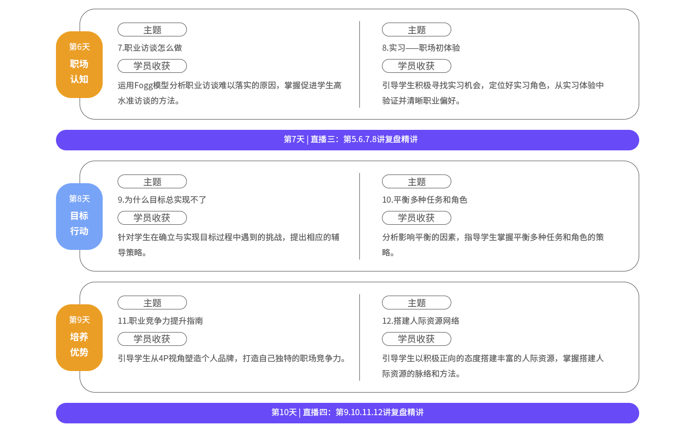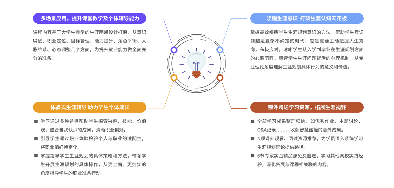 8大模块,16个问题场景,即可独立学习运用,亦有其内在的逻辑体系。以学生在大学时期间的真实生涯经历为主线,按照“唤醒生涯意识,促进规划动机→ 引领自我探索,清晰职业倾向→ 丰富职业体验,验证职业偏好→ 激励目标行动,提升能力资源→学习决策方法,直面未知世界”逻辑顺序,构建了大学生从规划到行动的完整体系。
