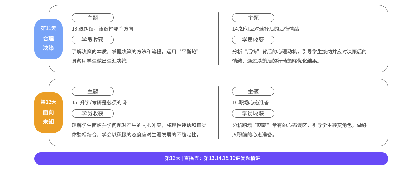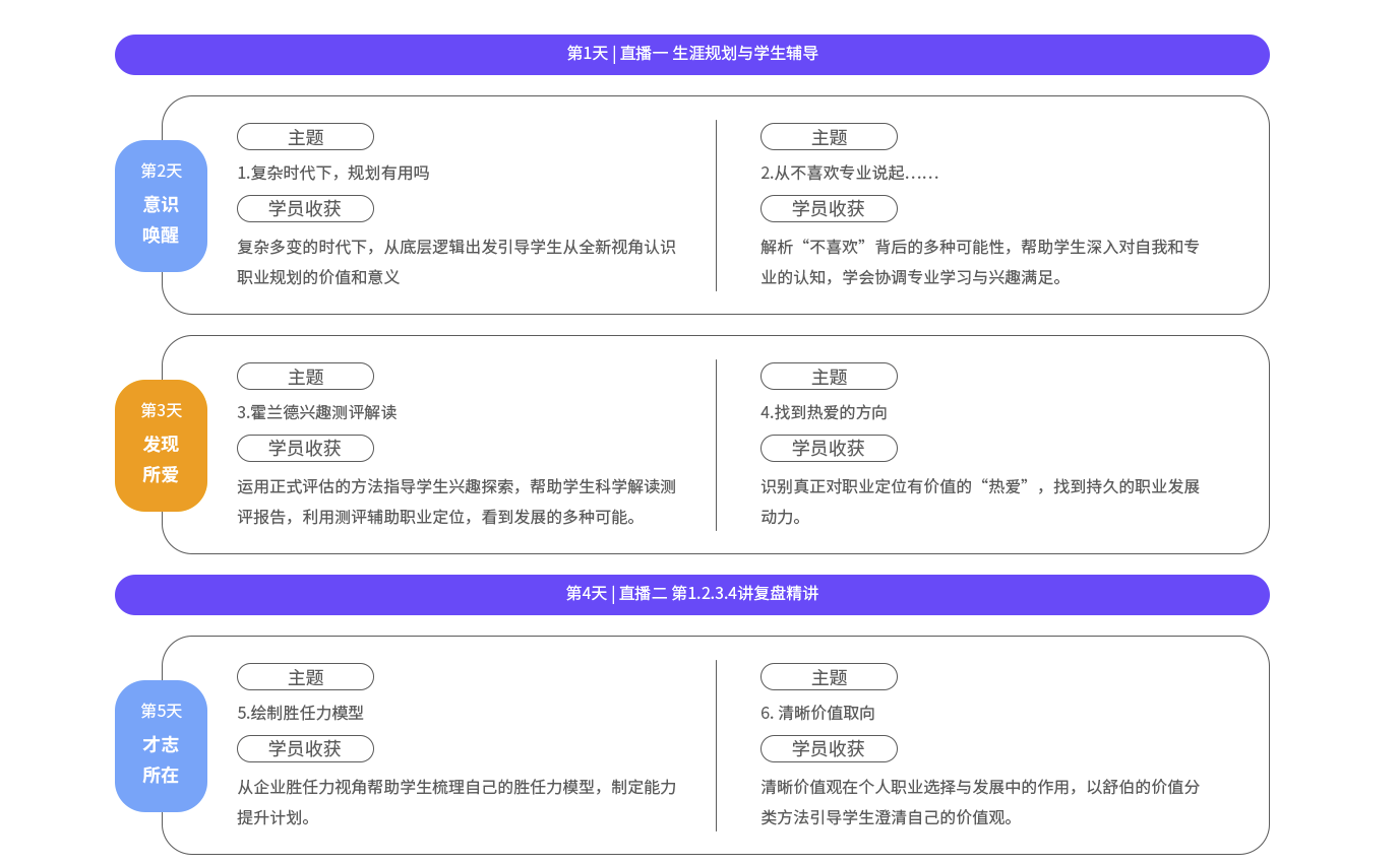 北森生涯十二位专家讲师合力研发,在梳理数百份大学生咨询个案的基础上开展课程设计。以真实的个案情境为开端,对问题产生的原因进行理论解读,提供解决问题的工具、方法和流程,兼顾理论性与实用性,助力高校老师对学生的生涯困惑精准定位,高效指导。