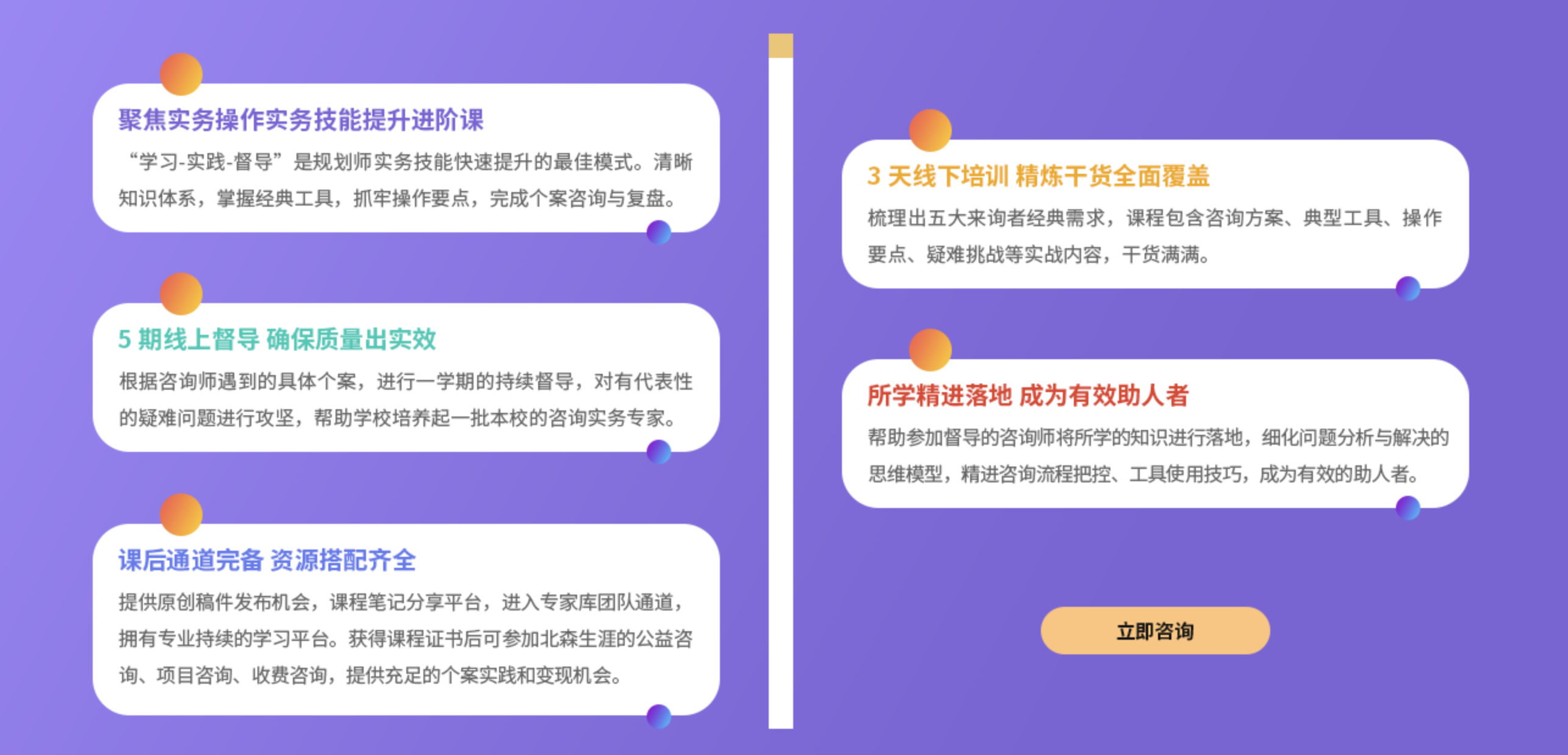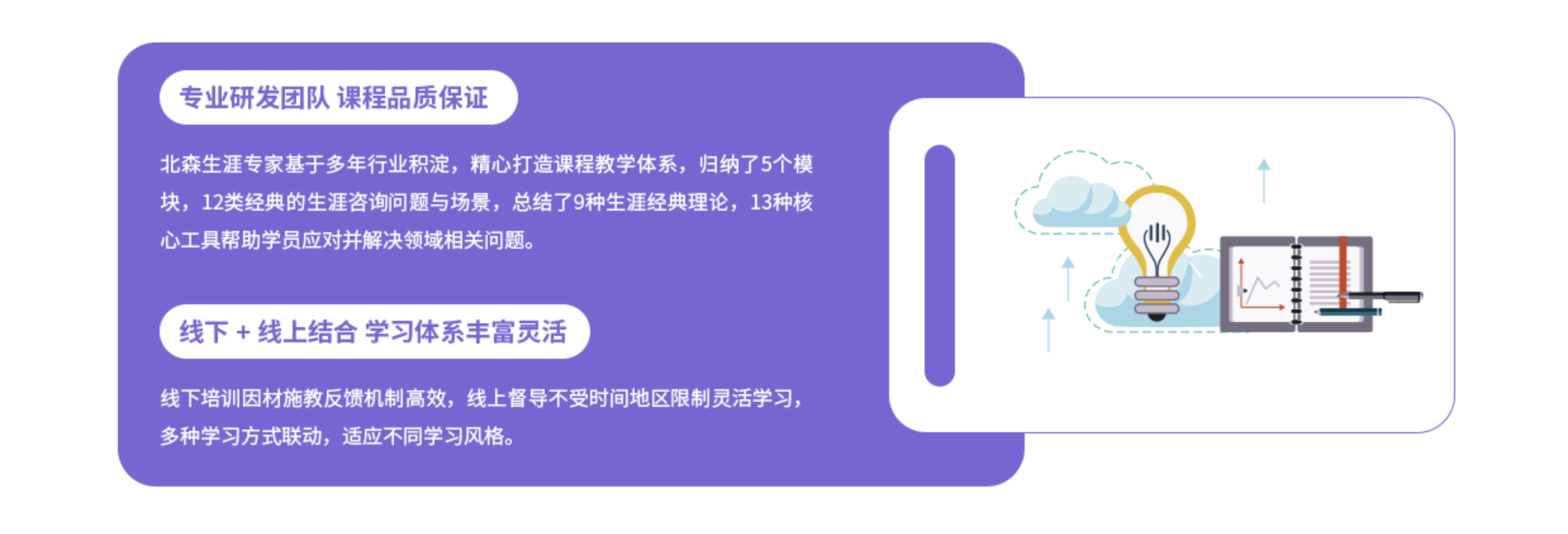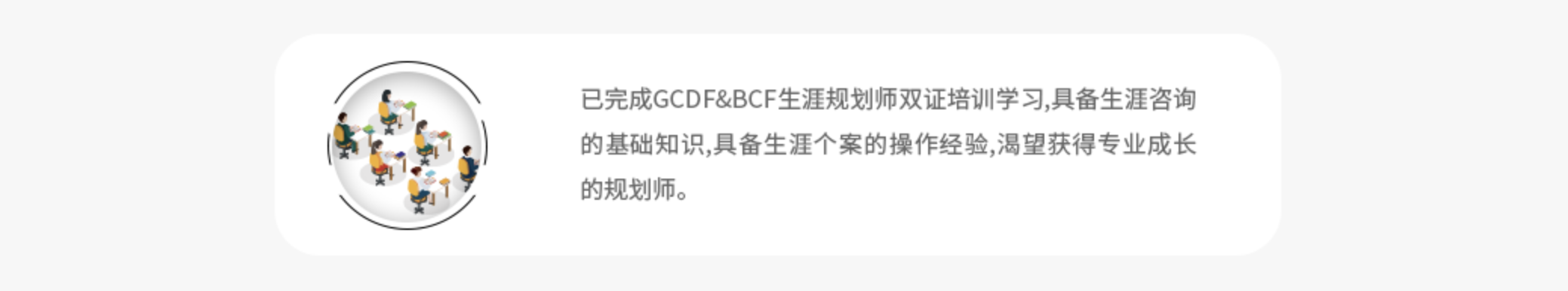 北森生涯的专业督导团队,十余年来坚持为20000余名受训的生涯规划师提供督导支持,在对1000+案例督导进行整合分析后,发现离校中很多新 手规划师存在共性的误区和常见问题c为了更好地支持高校生涯规划师针对不同需求的学生进行有效的方案设计,恰当地选择生涯规划的工具,并 保证操作时技术不变形等。基于大量学员的实务需求,北森生涯推出PCDF生涯规划实战训练营。
